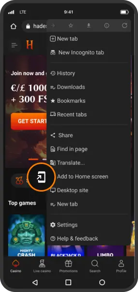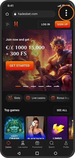 Go to the Hadesbet homepage and tap three dots to open the browser menu.