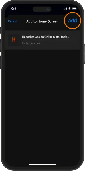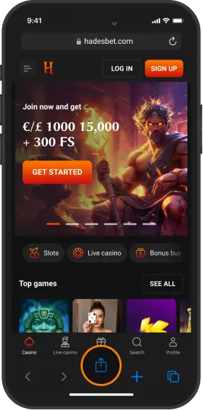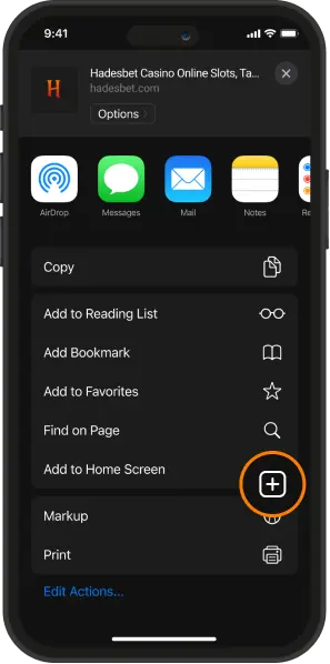 Open hadesbet.com with Safari, tap “Share” on the bottom navigation panel.